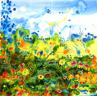 "Morning Light with Horsetail, Marigolds, and Dandelions" 2004 Mixed media and wax on Fabriano watercolour paper pasted on hardboard 121cm x 121cm x 2.5 cm Commissions taken for similar dimensions original artwork at the price of £1000 |