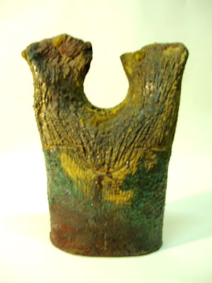 "The Poetry of Fire 6", 1997 View from the front. Smoked, Glazed Raku Stoneware, 1200 C, and wax. Approx. size: 30cm x 15cm x 8cm Price: £450 Not available for sale. Donated. |