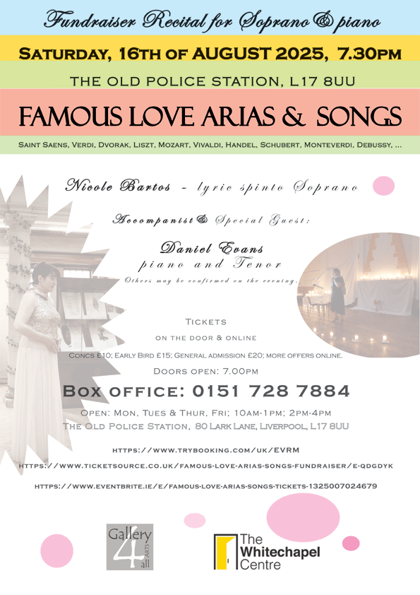 Gallery4allarts Services: What's on ? NEWS --------------------------------- Coming up 16th AUGUST 2025, 7.30pm, The Old Police Station Main Hall (at rear), 80 Lark Lane, Liverpool, L17 8UU _____________________ 1 Aug - 15th Oct 2025 Part of the Independents Liverpool Biennial Exhibition by Nicole Bartos The Quakers Meeting House Cafe, Liverpool L1 _______________________