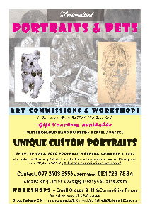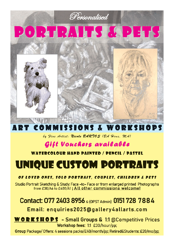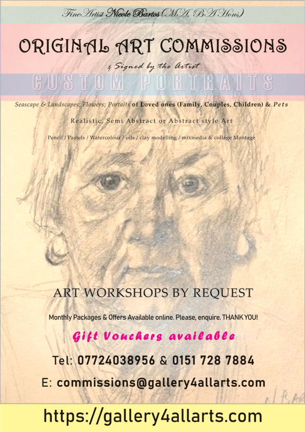 ______________________________ ----------------------------------------------------- *****Gift Vouchers available***** Small groups & 1:1 TUITION OUTDOORS & INDOORS General tuition offers: ______________________________ ******************************* _________________________________ Please, continue to support, Nicole Bartos and her creative activity by placing any ART or MUSIC commission or, by joining her classes, courses, workshops & events. All commissions welcome. Donations may also be offered online, during bookings for concerts/ tickets. MANY THANKS! Suggested commission topics: ABSTRACT ART; PORTRAITURE, Small scale murals; artworks: painting/ drawing/ installation, montage/ mixed media; portraits; landscape; landart; abstract. Face-to-face TUITION: small groups and 1:1 Bookings and Commissions in art, singing, larger group tuition are carried out outdoors in public green spaces. Please check courses page or, enquire. All commissions welcome. THANKS FOR YOUR SUPPORT! Gallery4allarts __________________ Check Newsletter for more details and updates. Follow this year's link. * For more art and events related information, please, refer to following links gallery or artist, exhibitions, concerts, Newsletter. * Thank you for your visit. Gallery4allarts