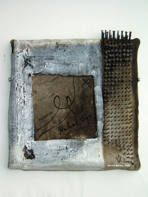"Instant Thoughts 8", 2006 View from the front. Smoked, Raku paper clay, porcelaine slip and nails, 1000C and 1180C Approx. size: 38cm x 34cm x 4cm Price: £309