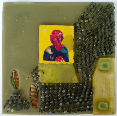 "Memories 3", 2005 Mixed media: dyed parafin wax, nails, fired ceramics, painted wood, textile cut-out 23cm x 23cm x 3cm