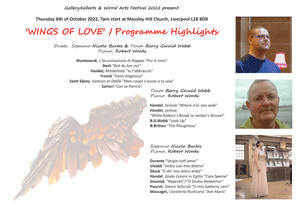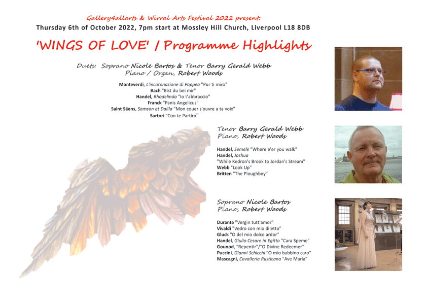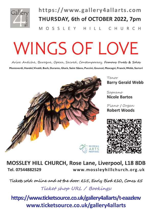 _________________________________________________________________________________ 2022 Thursday, 6th of October 2022, 7pm Start @ Mossley Hill Church, Rose Lane,Liverpool L18 'WINGS OF LOVE' Part of the Wirral Arts Festival programme Classical Music / Opera Recital