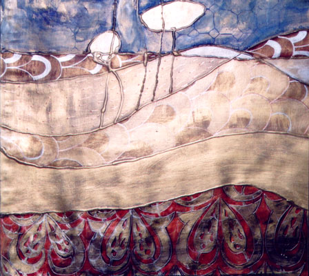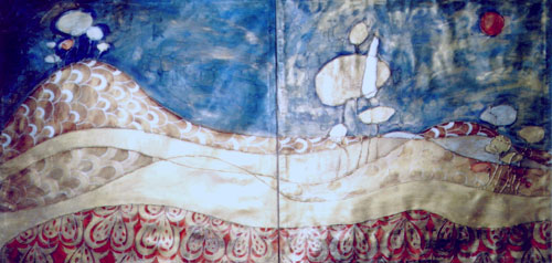 "Landscape with Poppy fields" (two canvases) 2000 Mixed media on canvas Approximative dimensions of the whole asemblage: 180cm x 90cm x 2.5cm This work is not available for sale. SOLD Commissions are taken for similar style work, for a price of £922. |